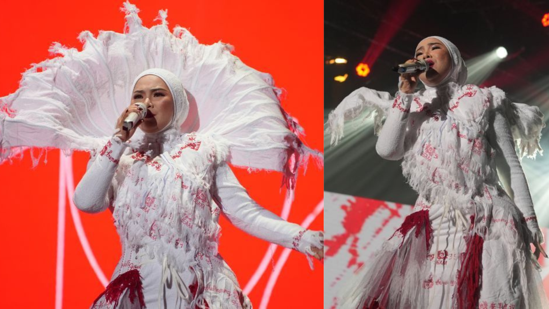 Penyanyi Aina Abdul sekali lagi mencuri tumpuan apabila tampil dengan busana yang dihasilkan menggunakan lebih 150 helai tuala ‘Good Morning’ ketika membuat persembahan di pentas Separuh Akhir Muzik-Muzik ke-40 pada malam Jumaat.