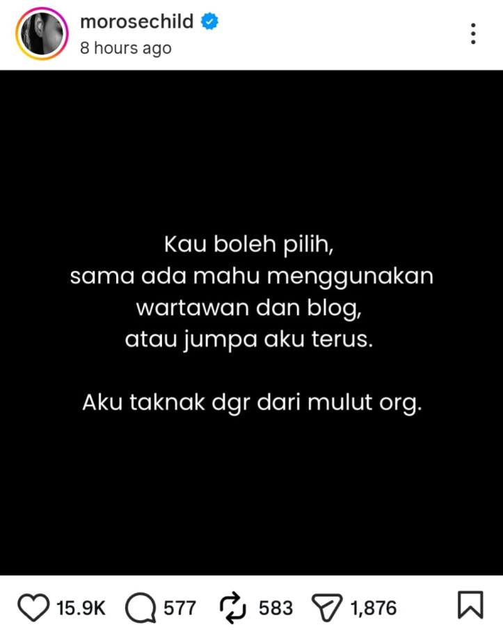 "Ada kau fikir perasaan mak aku, kesihatan mental mak aku waktu kau malukan dia di depan orang ramai? Kau komen mak aku tak didik aku. Kau sebut mak aku," tulisnya dalam hantaran di Instagram.